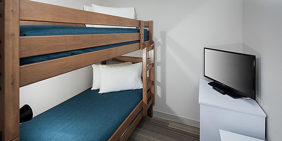 - Families can book a Family Suite that includes a queen bed, a private bunk bed area for the kids with a separate TV, plus a kitchen area for making family meals or snacks.