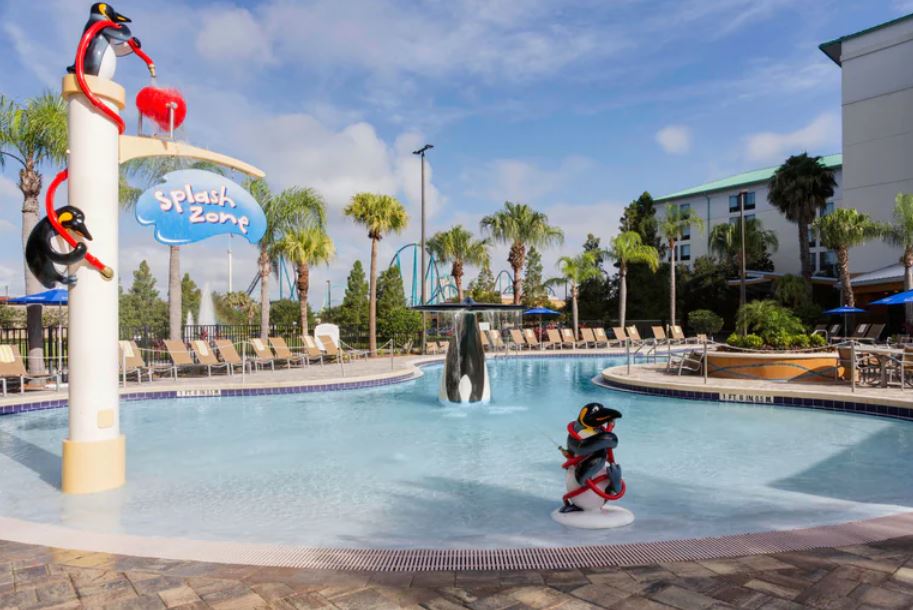 - Families can enjoy the SeaWorld-themed outdoor pool with kids splash zone.