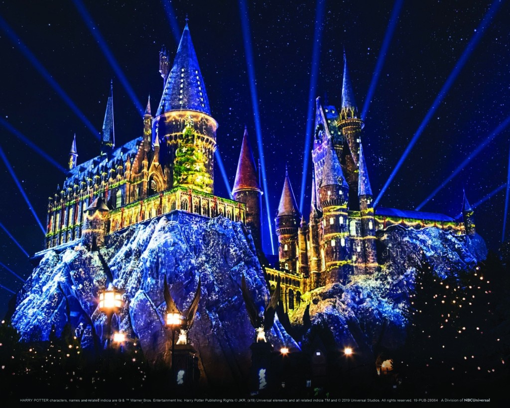 Christmas in The Wizarding World of Harry Potter transforms the quaint town of Hogsmeade into an enchanting holiday village. Seasonal décor is uniquely themed to each of the individual storefronts. In addition, a dazzling light projection spectacular brings the iconic Hogwarts castle to life.